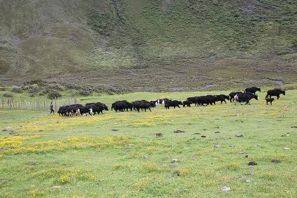 走到一處草坪,南杰和吉美下馬一起去扶雍貝,說是在此處稍作歇息。雍貝的臉色恢復(fù)了紅潤,他取下盤香枝插進(jìn)吉美濃密的頭發(fā)里,兩人由此發(fā)出了嬉笑聲。馬兒徑自走向草坪深處的水洼里飲水,打著酣暢的響鼻,頸項(xiàng)上銅鈴鐺隨馬兒鬃毛的抖動(dòng)發(fā)出了“鐺鐺”的聲音。馬兒飲飽了水,轉(zhuǎn)身朝我們走來。繼續(xù)騎行,不知過了多久,日光在頭頂上游移,漸漸偏西。雍貝在前方問南杰,阿尺,巴烏牧場還有多遠(yuǎn)?南杰指向眼前的山峰說,登上這座峰頂就到了?;赝宦方?jīng)過的河谷,早已不知去向,我們身處的位置幾乎與周遭巍峨的山巒平齊了。我從衣兜里取出手機(jī)測試海拔高度,4820米。