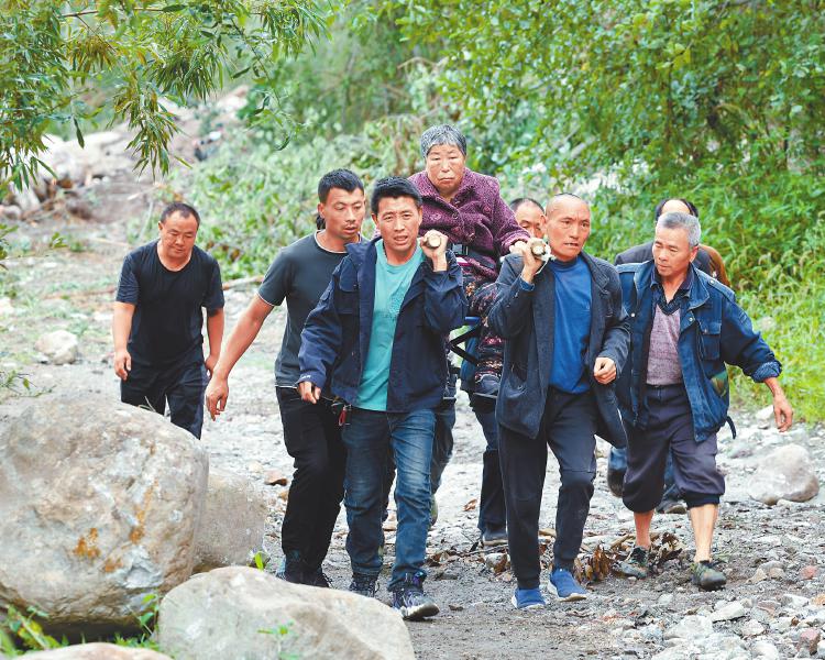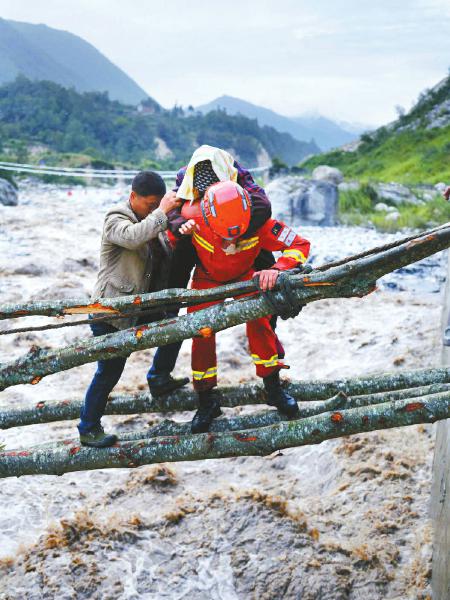 海螺溝景區(qū)通往磨西鎮(zhèn)道路因地震山體滑坡中斷,9月6日,救援人員背著一名2歲幼童,帶領(lǐng)被困群眾翻越百米滑坡帶。