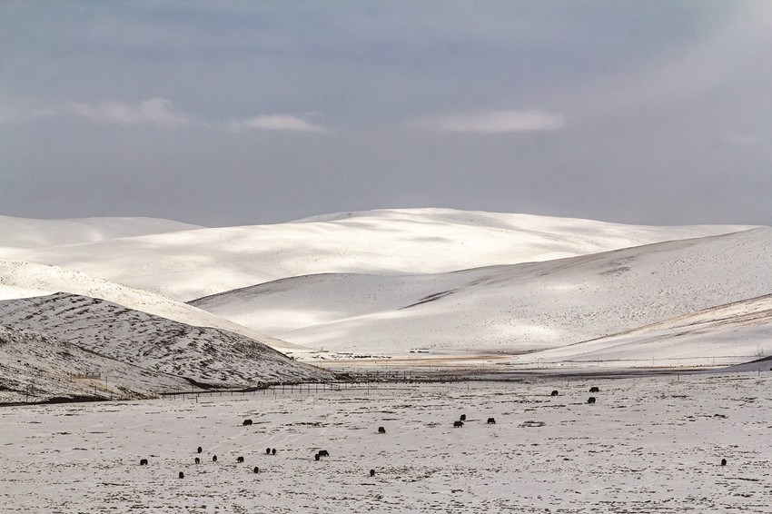 雪后的高原,藍(lán)天白云,大地和連綿到天邊的遠(yuǎn)山,就像被什么過濾了一樣,一片潔白,滿眼凈是純凈的美,全然沒有冬日的荒涼,更顯空靈、大氣,盡顯高原獨(dú)特的美。白雪覆蓋的村莊、牧場(chǎng)被河流、大路小徑串連起來,寧?kù)o、秀美,像一幅幅天然的水墨畫,美不勝收。