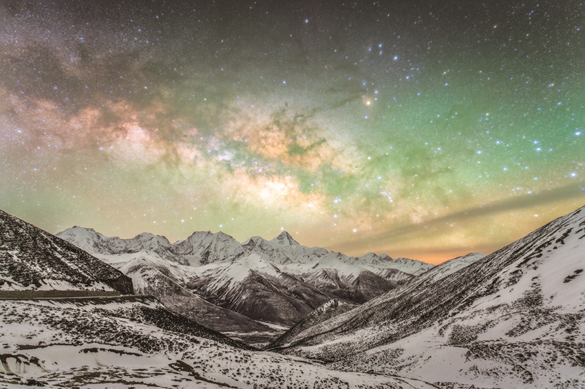 我州地廣人稀、海拔較高,光污染較少,離康定城區(qū)不遠的折多山頂、子梅埡口、雅哈埡口等地,云層稀薄,空氣干燥,視野開闊,晴朗天氣下,每當(dāng)夜幕降臨,銀河肉眼清晰可見,如煙似紗,置身其中,如夢似幻。星河像一道氣勢磅礴的瀑布、一幅色彩斑斕的油畫、一束絢麗多彩的禮花,令人贊嘆,驚艷眼球,壯美異常。