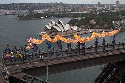 當日,由當?shù)厝A人團體精心準備的中國傳統(tǒng)舞龍亮相悉尼海港大橋,拉開中國新年慶?;顒拥男蚰?。
