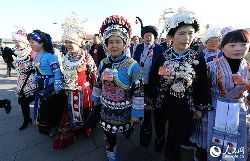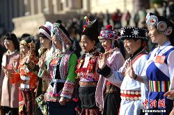 3月5日,第十二屆全國人民代表大會(huì)第二次會(huì)議在北京人民大會(huì)堂開幕。云南少數(shù)民族代表在進(jìn)入會(huì)場前合影留念。中新社發(fā) 駱云飛 攝
