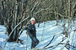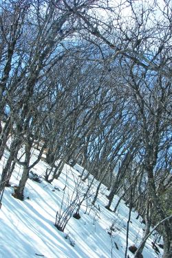 在馬鞍山頂?shù)谋泵婕氨逼拢幸黄坏竭呺H的樹(shù)林。冬天的這片樹(shù)林,呈成熟而貴氣的暗褐色,葉落枝出,紛亂、素凈、蕭瑟、清貴。于是,以雪地和樹(shù)林作背景,也照了不少相。