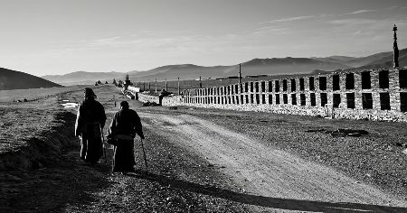 走近了,你會看見砌墻的石片上刻著密密麻麻的經(jīng)文;綿延的墻體上嵌著一個個窗口式的佛龕;每隔一段距離,石墻圍出一個回環(huán)的空間,類似于城墻上的烽火臺;長墻的兩端立著高大的佛塔,中段的108座佛塔排成長長的隊伍,和長墻并行。