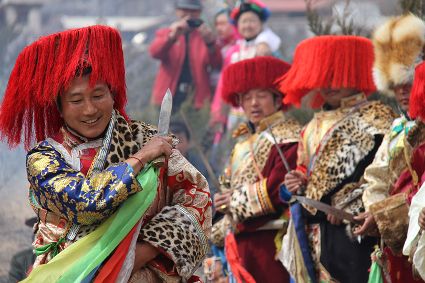 除了歌舞文化,德欽還是民俗文化最大的平臺(tái),神山祭祀是村村寨寨必不可少的活動(dòng),在德欽,藏民對(duì)山水自然賦予了靈性,認(rèn)為自然也是和人一樣有著生命和靈性,尊重自然演繹出神山祭祀活動(dòng)豐富多彩?!暗顿潯?藏語(yǔ)稱“百諧”。在德欽農(nóng)村,刀贊是祭祀活動(dòng)的重頭戲,這一天,不亞于一個(gè)盛大的服飾表演。相傳“百諧”是古時(shí)村民為消除戰(zhàn)亂,祈福平安的一項(xiàng)傳統(tǒng)祭祀活動(dòng),延續(xù)至今已經(jīng)成為一項(xiàng)傳統(tǒng)的民俗活動(dòng)?!鞍僦C”既是祭祀活動(dòng)的一個(gè)儀式,也是一個(gè)獨(dú)立的傳統(tǒng)民俗活動(dòng),村里每戶一男丁在這一天必須參加“百諧”?!疤K夏”是村里男人戴的最為隆重的帽子,他不同于金邊帽和狐皮帽。長(zhǎng)刀是“刀贊”的道具, “吉祥的日子里,我們一敬天地,賜給我們帶來(lái)幸福的生活;再敬尊敬的共產(chǎn)黨,為我們帶來(lái)平安吉祥;三敬慈祥的雙親,教會(huì)我們?nèi)绾巫鲆粋€(gè)好人……”朗朗上口的說(shuō)詞伴著閃閃的刀光起舞,頗具康巴壯士的英武陽(yáng)剛。