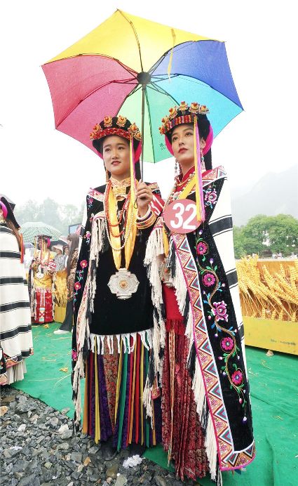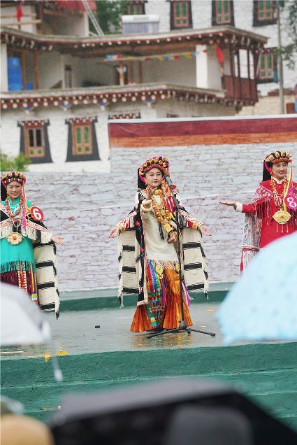 比賽開始不久,現(xiàn)場下起了小雨,但絲毫沒有影響熱烈氣氛。臺上的佳麗們,略施粉黛,穿著承載著嘉絨風情文化的民族盛裝,自我介紹,優(yōu)雅展示。臺下,則是鄉(xiāng)民齊聚,熱情高漲。大家紛紛到場,為佳麗們加油助威。據(jù)介紹,丹巴出美女始于漢代的東女國時期。古時每年農(nóng)作物收獲的時節(jié),丹巴各村各寨都要舉行盛大的選美和祭祀活動。