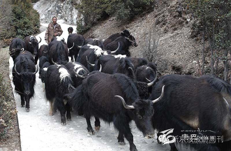 從沖古寺,我們乘坐觀光車前往洛絨牛場(chǎng)。這一路,我們碰到了牦牛群,放生的羊群,還有馱東西的馬幫。