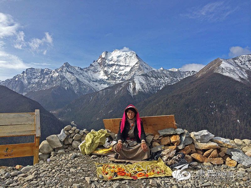 去往亞丁風景區(qū)的路上,一位藏族婦女在觀景臺邊擺著地攤賣當地首飾和特產。![]()