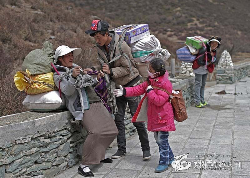 在海報4000多米的亞丁景區(qū),幾名當地居民背著重達百余斤物品走五公里往牛奶河居住地。通往洛絨牛場的山路。
