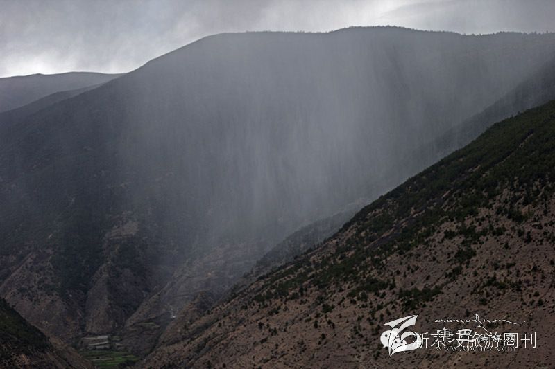 在神山腳下,佛教徒放生的一些山羊和游客親密無間。山區(qū)氣候多變,一場大雨突如其來。