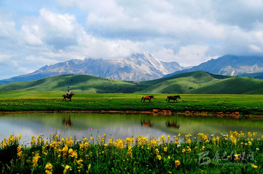 夕陽照耀湖水,閃著金銀光;綠樹撐著青天,到處莽蒼蒼;牧民家的房子,五彩斑斕樣;藍(lán)色天空之上,白云在飄蕩;青石河岸之畔,繽紛百花香……這里是寫生的圣殿,這里有攝影的天堂,這里是讓人魂?duì)繅?mèng)縈的夢(mèng)里仙鄉(xiāng)。
