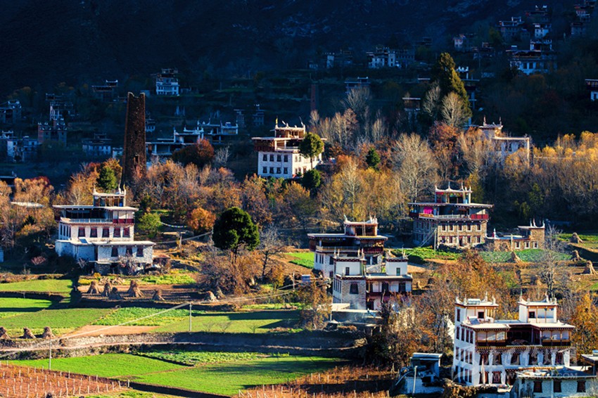 遠(yuǎn)遠(yuǎn)望去,一座座藏寨被色彩斑斕的彩林包圍之中,或稠密集中,或星落棋布,或在高山懸崖上,或在河壩綠茵間……伴著潺潺溪流,在緩緩升起的太陽照射下,隱在密林深處的寨房和農(nóng)田形成一幅美輪美奐的畫卷,可謂是“人間天堂”。