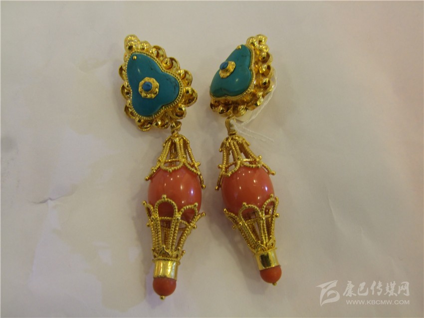 經(jīng)典的紅綠配耳環(huán)。撞色一直都是永不落伍的時(shí)尚,紅綠搭配的巧合,是藏民族熱愛生命與熱情好客的象征,用流光溢彩的金色將紅與藍(lán)包圍并連接,看起來協(xié)調(diào)而美好,搭配起來更為時(shí)尚。據(jù)店家介紹,此款耳環(huán)凈重22.75克,加上手工費(fèi),售價(jià)7000余元。