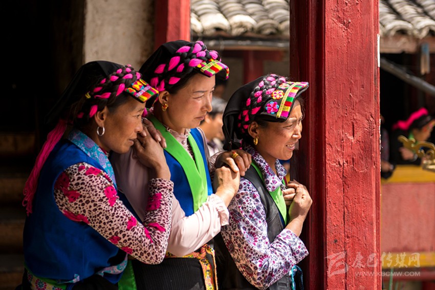 在魚通地區(qū),不少人還保持著古老的裝束,男子穿青色或黑色的長(zhǎng)布衫,用布帶束腰,勞作或天冷時(shí)會(huì)在外加一件用動(dòng)物皮加工做成的皮褂子,老人以青布包頭,帕長(zhǎng)約3丈左右,纏成大盤頭。女子也穿長(zhǎng)衫,頭戴方形青色頭帕,腰系圍腰帕。頭帕繡有彩色花邊,發(fā)辮用青色、藍(lán)色或紅色的絨線盤于頭帕之上。圍腰帕為梯形,上窄下寬,邊緣用藍(lán)色或淺綠色布料做裝飾。圍腰帕分為兩種,一種繡著各種精美圖案,一般在重大節(jié)日和喜宴上穿戴,一種比較簡(jiǎn)潔素凈,一般在日常生活中穿戴。