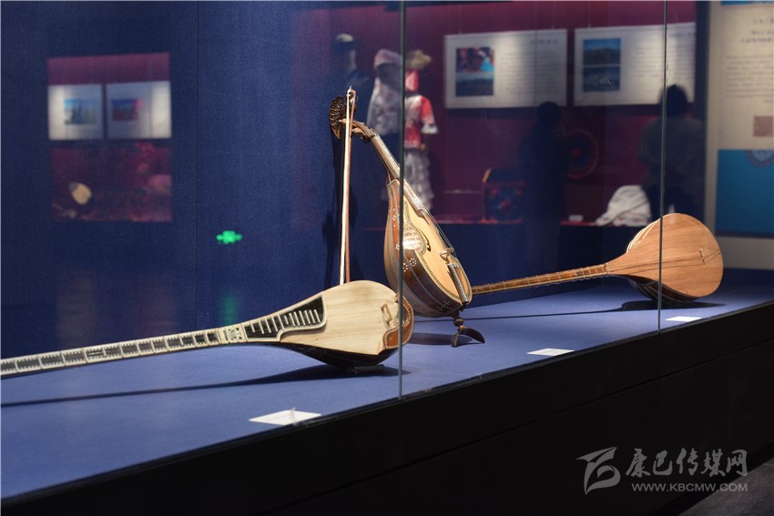 走進(jìn)凹字型的展廳內(nèi),可見(jiàn)蒙古族的馬頭琴、哈薩克族的冬不拉、維吾爾族的手鼓朵帕、回族的掛毯湯壺等。展覽以實(shí)物和圖片相結(jié)合的形式,從“草原驕子”、“刀郎木卡姆”、“駿馬與詩(shī)歌”、“花兒與少年”四部分展現(xiàn)博爾塔拉草原上各民族獨(dú)具魅力的生產(chǎn)方式、衣食住行、傳統(tǒng)技藝、民族服飾、文化娛樂(lè)等民俗風(fēng)情,為觀眾呈現(xiàn)了博州異彩紛呈的地域文化。