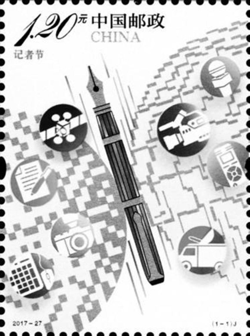 為紀(jì)念第18個(gè)記者節(jié)。中國郵政定于2017年11月8日發(fā)行《記者節(jié)》紀(jì)念郵票一套1枚。郵票圖案采用了具有現(xiàn)代感的構(gòu)成手法及色彩表達(dá)方式。畫面中的鋼筆象征了記者秉持弘揚(yáng)民族精神、維護(hù)國家利益和社會(huì)責(zé)任的專業(yè)精神和自信風(fēng)范。兩側(cè)的線條及方點(diǎn)構(gòu)成的兩個(gè)圓形圖案分別隱喻地球和現(xiàn)代網(wǎng)絡(luò)體系,表示在新媒體時(shí)代,新聞傳播媒介所呈現(xiàn)出的多元化、全球化的發(fā)展態(tài)勢。畫面中麥克風(fēng)、攝像機(jī)、錄音筆等形式各異的采編設(shè)備圖標(biāo),結(jié)合衛(wèi)星及地面發(fā)射站等元素,突出了當(dāng)代記者巨大的社會(huì)影響力。同時(shí),鋼筆和兩側(cè)的圓形圖案共同組成了一只振翅飛翔的蝴蝶形象,喻意了記者追求至善至美,在探訪報(bào)道中擔(dān)負(fù)著傳播先進(jìn)文化,引領(lǐng)和維護(hù)和諧社會(huì),推動(dòng)人類文明的崇高使命和社會(huì)責(zé)任。