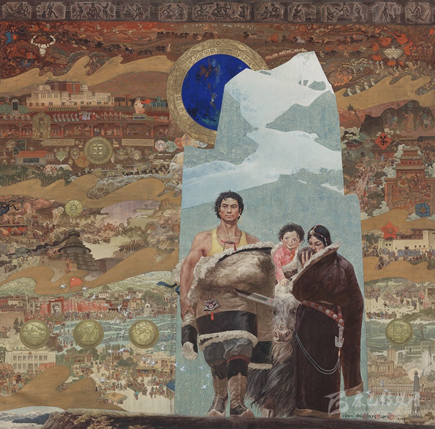 15世紀(jì)以來,唐卡發(fā)展所恒定的兩個元素:一是平面構(gòu)圖的神佛之境,另一則是吸收大青綠山水精髓。正如DNA鏈的雙螺旋結(jié)構(gòu)一般,使唐卡繪畫在歷史時空中穿插縈繞,在雪域各地生根開花。到了公元20世紀(jì)初,照片的高度寫實促使藏地畫家邁出了革新步伐,使得唐卡繪畫逐漸擺脫傳統(tǒng)束縛,開啟了“人”的覺醒。衛(wèi)藏地區(qū)出現(xiàn)了“根敦群培、安多強巴”引入寫實主義的嘗試,成為當(dāng)今西藏“布面重彩”的先驅(qū)。新中國成立后,內(nèi)地的美術(shù)創(chuàng)作積極影響了三大藏區(qū)的繪畫發(fā)展,上世紀(jì)80年代,四川康區(qū)“甘孜藏畫”肇起,在《嶺·格薩爾王》人文主義的召喚下,《雪山兒女》《唐東杰布》《新概念唐卡》正從歷史深處一路走來。而近年來,安多藏區(qū)則創(chuàng)新出了“藏族祥巴版畫”,祥巴版畫不僅是從材料技法上對西藏繪畫的豐富,更是藏地畫家們在自覺不自覺的求新、求變;甚至在傳統(tǒng)唐卡領(lǐng)域,民間畫師也都在紛紛嘗試將傳統(tǒng)唐卡和現(xiàn)代審美相結(jié)合。這一切,正是唐卡繪畫從傳統(tǒng)走向現(xiàn)代、由宗教博衍至生活的演變過程,在這個過程里,藏地畫家不僅在畫面的形式和語言上完成了傳統(tǒng)與當(dāng)代的統(tǒng)一,還將西藏的審美特質(zhì)虹化為作品的精神內(nèi)核。這也是唐卡藝術(shù)第二次“從香巴拉到人間”的過程,成為民族文化發(fā)展的新坐標(biāo)。