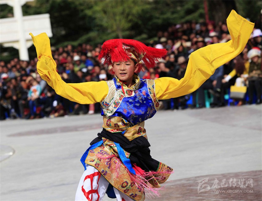 與藏族鍋莊不同,巴塘弦子在表演時,隊伍前面由數(shù)名男演員手持拉弦樂器“畢旺”,在隊伍前面一邊演奏一邊歌唱一邊領(lǐng)舞。其余的女舞者則跟在后面,舞動著長長的衣袖,邊歌邊舞,在行進(jìn)中跳成一個圓圈,然后不停旋轉(zhuǎn)。