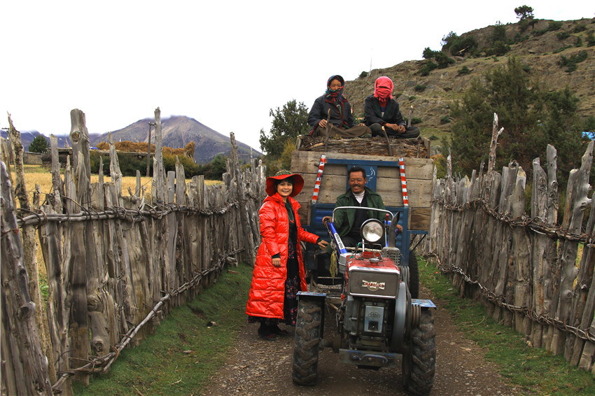 不久雨停下來,山邊露出一縷陽光,天空又是一片碧藍。我們趕緊繞道藍湖驛站后面的牧場上,發(fā)現(xiàn)一座臨時搭建的軍用鐵橋可是通向一個小島。走過去,島上景色更美,遠處雪山冰川倒影晶瑩碧藍的水中,近處綠樹滿山,草場上牛羊星星點點。島上的小村莊叫阿日村,住著十幾戶人家,青稞剛收獲完畢,男人正忙著把牛羊過冬的草料堆積在高高的木架子上,女人除了撿牛糞外,還要準備冬天取暖的柴薪。雖然村民大多不能講漢語,但對陌生人通常會含笑致意,一個小伙子還用結(jié)結(jié)巴巴的漢語重復(fù)了兩遍“喝不,青稞酒?”。我們到村民達娃卓瑪家,她是家里四個孩子中的老大,今年二十二歲,最小的弟弟不到五歲。她上過三年小學(xué),能講一點漢語,臨時充當家人的翻譯。父母和奶奶見有客人來,非常熱情,立馬打酥油茶,并端上一盤奶渣,因為不會講漢語,只好不停招呼我們“吃,多吃”。家里的客堂兼經(jīng)堂寬敞干凈,廊柱和供案施以彩繪,供案上擺放兩個活佛的一尺見方的照片,前排供了酥油燈、糌粑和清水。
