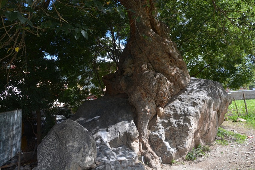 如今古桑抱石守衛(wèi)著巴塘這片熱土近千年,對(duì)研究巴塘的人文和氣候變化有極其重要的價(jià)值,保護(hù)好它理所應(yīng)當(dāng),擔(dān)心的是巨石旁長起兩棵皂莢樹,已比碗口還粗,大有后來居上之勢(shì),若不未雨綢繆,必勢(shì)大難除。