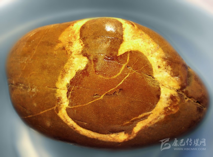 作為一個(gè)無(wú)組織的業(yè)余獨(dú)行淘石者,經(jīng)過(guò)數(shù)年的摸、淘、琢磨,我悟出:發(fā)掘趣石最重要的是要獨(dú)具慧眼慧心,會(huì)讀石紋。是否讀懂石紋,決定著一塊石頭是頑石還是奇石的命運(yùn)。這是一件很難的事,不僅要運(yùn)用你獨(dú)特的審美視角,還得發(fā)揮你豐富的想象。有時(shí),為了讀懂一些石紋,我會(huì)抱著這塊石頭如考古學(xué)家般仔細(xì)琢磨,從正面、側(cè)面,再到背面,又從左邊旋到右邊,或者上下顛倒來(lái)打量……一番冥思苦想,會(huì)意會(huì)神,直到靈感涌起、慧心頓悟,尤如洞天石扉訇然中開(kāi),眼前的頑石拙巖,頃刻便化為藝術(shù)珍寶,令我欣喜若狂。正如悉達(dá)多說(shuō):“這塊石頭是石頭,它也是動(dòng)物,也是神,也是佛,我敬重它和熱愛(ài)它,并非因?yàn)樗谐蝗諘?huì)變成這個(gè)或那個(gè),而是因?yàn)樗缇褪沁@一切,一直是這一切?!背錆M靈性的石頭在你和美妙的自然間搭起了一座通靈的橋梁。淘得趣石,還需緣分。就像人與人的相遇講究緣分,遇到心儀的石頭也講究緣分天助。有年春節(jié),我與父親去河邊轉(zhuǎn)游,面對(duì)涪江寬闊的石灘,我的淘石癮又犯了。但出門前答應(yīng)過(guò)父親,這次只逛不撿石頭。我知道老爸心疼我一個(gè)女子大過(guò)年的撿石頭。河邊冷,且石頭扛起來(lái)很重,手與衣服都會(huì)弄得很臟。我邊陪父親漫走閑聊,眼睛卻止不住往河灘逡巡,仍希望無(wú)意中淘到中意的石頭。走著走著,我發(fā)現(xiàn)有一群鳥(niǎo)歡唱著從遠(yuǎn)處一個(gè)石堆飛起,冥冥中感覺(jué)那里有寶貝,遂向老爸懇求,過(guò)去看一下就回來(lái)。來(lái)到那個(gè)石堆中心,幾乎不費(fèi)什么功夫,就看到一塊橢圓形石頭上有著一個(gè)自帶金色佛光圈的如來(lái)佛半身像。我怔住了,有點(diǎn)不敢相信如此幸運(yùn),蹲在那里久久打量。老爸隨后趕過(guò)來(lái),看到佛像石,連連贊嘆了好幾句“太神奇了”。然后,他毫不猶豫地就幫我把石頭搬起來(lái)就走。回到家中,如獲至寶的我,趕緊清洗石頭,在清水的滋潤(rùn)下,佛像的輪廓更加清晰。頸上的佛珠、袈裟線也分明,細(xì)看令人叫絕的這竟是一尊三面佛:正面、左側(cè)向、右側(cè)向均是佛。而在此石背面,也清晰出現(xiàn)了一個(gè)草書的“吉”字,真令人喜出望外。吉佛石,就這樣神奇地走進(jìn)了我的生活,讓我相信一切緣分都是可遇不可求的。