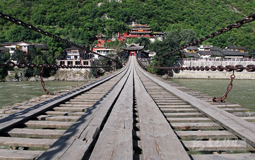 站在岸頭眺望,不遠(yuǎn)處凌空橫跨一座懸掛式的鐵索橋,長虹般地飛躍顯示出它的磅礴氣勢與雄壯高大,波濤滾滾的大渡河,像千萬匹脫韁的怒馬,從峽谷中大聲吼叫著飛奔而來砰然萬里;行人在橋面上走動,仿佛在蕩秋千,腳下漂浮不定,步履蹣跚。人數(shù)稍多時,橋面便晃晃悠悠,感到頭重腳輕,想踩穩(wěn)腳步著實不易。洶涌澎湃的狂濤讓人瞬間感覺暈暈乎乎,顫顫巍巍。此情此景,印證了流傳在當(dāng)?shù)乩习傩罩械膬删浯蛴驮姡捍蠖珊永锢藵凉?,鐵索橋上打閃閃;此時此刻,游客才真正體驗和感悟得到紅軍22勇士當(dāng)年冒著敵人的槍林彈約,飛奪瀘定橋時有何等的艱難與險阻……