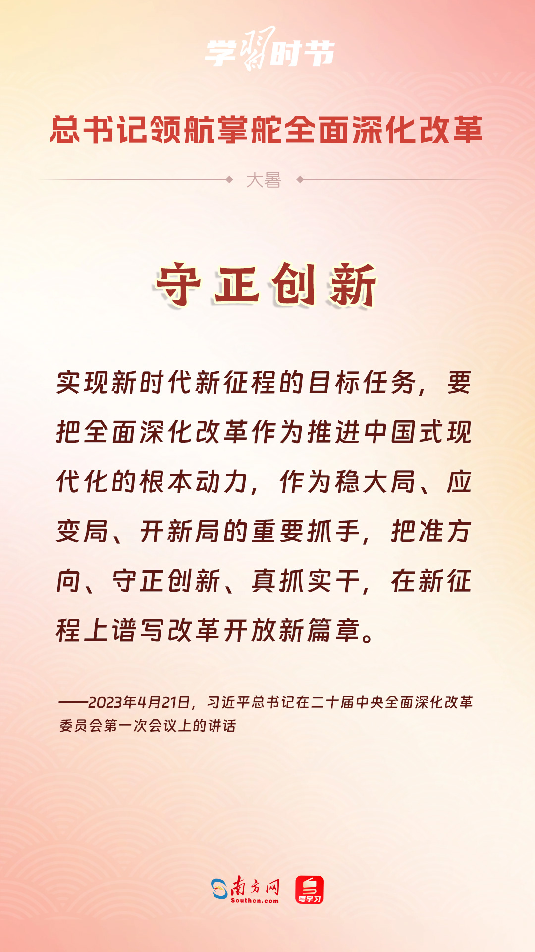 黨的十八大以來(lái),習(xí)近平總書(shū)記親自領(lǐng)導(dǎo)、親自部署、親自推動(dòng)全面深化改革工作,推動(dòng)全面深化改革事業(yè)在攻堅(jiān)克難中不斷邁上新臺(tái)階、取得新勝利。在驕陽(yáng)似火的大暑時(shí)節(jié),通過(guò)一組海報(bào),讓我們共同學(xué)習(xí)習(xí)近平總書(shū)記關(guān)于“全面深化改革”的重要論述。