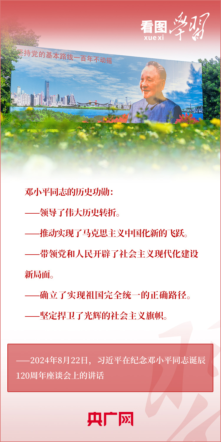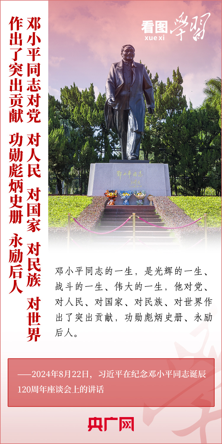 8月22日,習(xí)近平總書記在紀(jì)念鄧小平同志誕辰120周年座談會上發(fā)表重要講話指出,鄧小平同志的歷史功勛是全方位的、開創(chuàng)性的,對中國和世界的影響是深刻的、長遠(yuǎn)的??倳洀?qiáng)調(diào),對鄧小平同志最好的紀(jì)念,就是把他開創(chuàng)的中國特色社會主義事業(yè)繼續(xù)推向前進(jìn)。我們要緊緊圍繞以中國式現(xiàn)代化全面推進(jìn)強(qiáng)國建設(shè)、民族復(fù)興偉業(yè)這個中心任務(wù),繼往開來,奮發(fā)進(jìn)取。一起來學(xué)習(xí)!