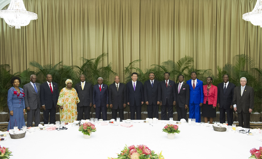 ??圖為2013年3月28日,國家主席習(xí)近平在南非德班同非洲國家領(lǐng)導(dǎo)人早餐會(huì)合影。新華社發(fā)