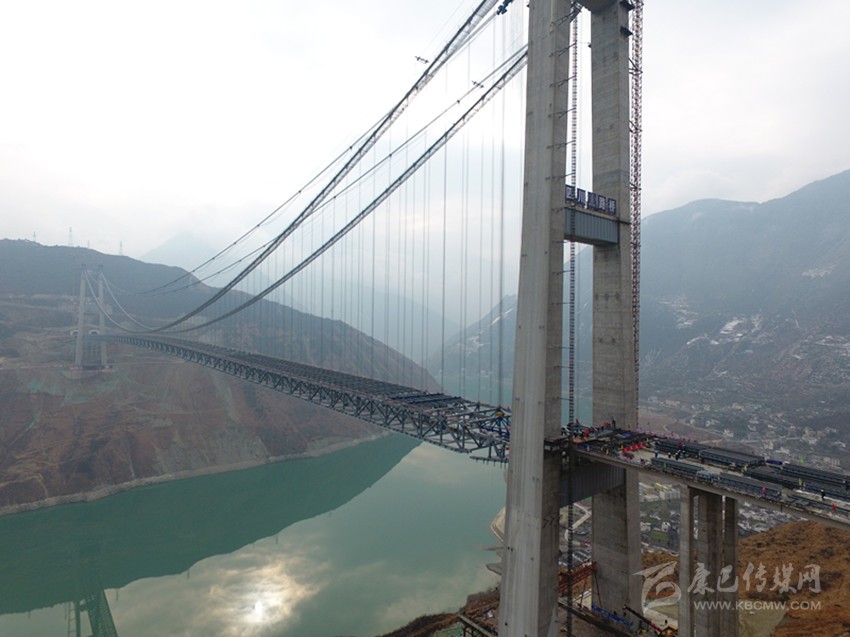 “大橋鋼桁梁完成合龍,標志著大橋全面進入橋面施工階段,也標志著這座建設(shè)在高海拔、高地震烈度帶、復雜風場環(huán)境下的超大跨徑鋼桁梁懸索橋,施工中最難、風險最大的施工全面完工。”雅康高速項目部副經(jīng)理柏國勝激動地說。