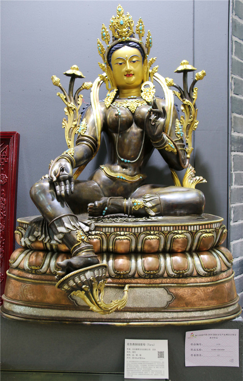 本網(wǎng)訊(記者 宋志勇 文/圖)“這是由什么材料鑄成的物件?”“這件作品的寓意是什么?”“這是一件花色青銅《綠度母佛像》,分別由金、銀、銅鑄成,高100cm、寬50cm,綠度母為觀世音菩薩的化身。”5月12日是第十四屆中國(深圳)國際文化產(chǎn)業(yè)博覽交易會第三天,甘孜展館迎來了眾多參觀者,在館內(nèi)市民正與白玉縣董察文化發(fā)展有限責任公司董事長日多一問一答。