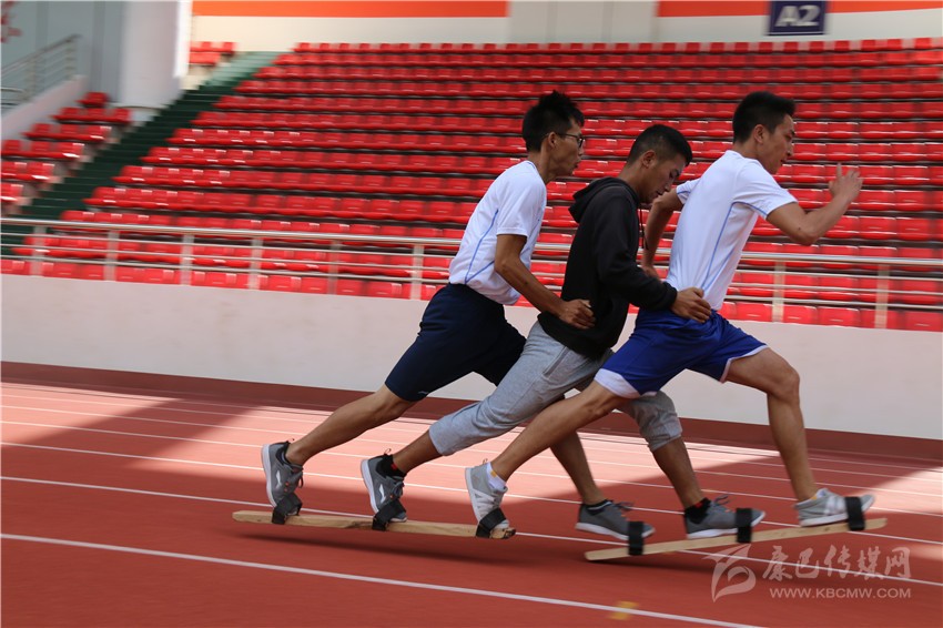 “啪,啪,啪……”,在高腳競速訓(xùn)練場地的對面,板拍打地面的聲音有節(jié)奏地在賽道上回蕩著。記者看到4組板鞋競速隊(duì)正在有序訓(xùn)練,每隊(duì)有三名運(yùn)動(dòng)員,他們都把腳套在一個(gè)木板鞋上,后面的兩個(gè)運(yùn)動(dòng)員把手放在前一個(gè)運(yùn)動(dòng)員的腰上,三個(gè)人齊心協(xié)力,喊著有節(jié)奏的口號,彼此邁著統(tǒng)一的步伐為了共同的目標(biāo)而前進(jìn)。每一組的隊(duì)員都是齊心協(xié)力,好像他們已然融為一體,步伐的頻率和擺臂的頻率都是一致的,絲毫沒有違和感。