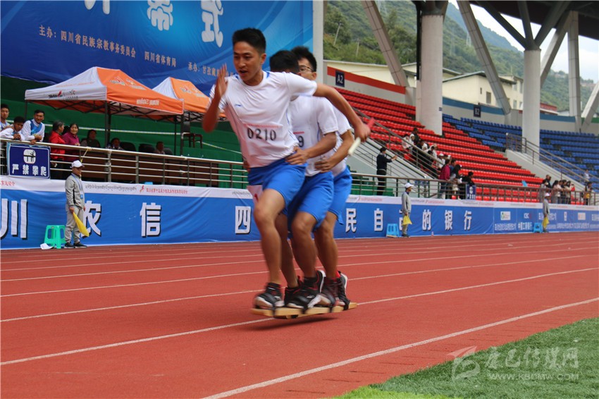 昨(5)日,在康定北門體育場舉行的男子板鞋競速項目的現(xiàn)場,記者看到,參加板鞋競速的各代表團(tuán)的三名運(yùn)動員將腳套在一雙板鞋上,第一名隊員揮動著手臂,后二名隊員扶著前面隊員的腰,步調(diào)一致地行進(jìn)著。