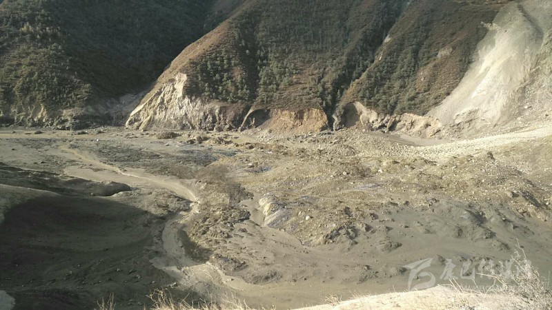 上午10點(diǎn)過,突擊隊(duì)抵達(dá)生公村一個(gè)山坡上,看見了堰塞體。隨后,突擊隊(duì)繼續(xù)出發(fā),下午5點(diǎn)過,突擊隊(duì)終于抵達(dá)了距離壩體約200米遠(yuǎn)的地方,并在這里用衛(wèi)星電話向后方播報(bào)了信息后,便攀上了高約70米,寬約200米的堰塞體實(shí)地查勘,并再次向后方匯報(bào)了情況。