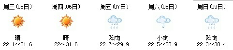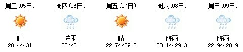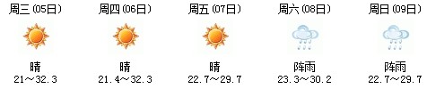雖然明天太陽有點兇,但7日、8日、9日三天陣雨及時出現(xiàn),日最高氣溫穩(wěn)定在30℃附近。