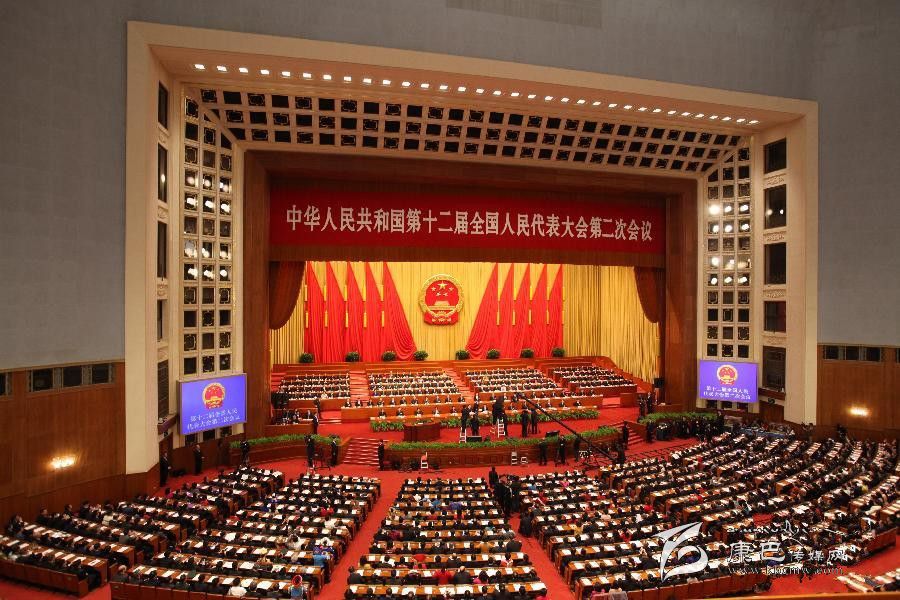 上午9時(shí),張德江宣布:中華人民共和國第十二屆全國人民代表大會(huì)第二次會(huì)議開幕。會(huì)場全體起立,高唱國歌。