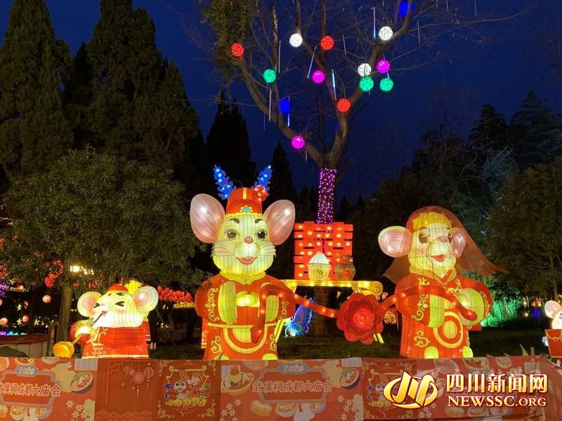 據(jù)成都武侯祠博物館工作人員介紹,“2020武侯祠成都大廟會”對燈組景觀和光影效果進(jìn)行了全面升級,正門燈組主架構(gòu)以漢闕風(fēng)格和傳統(tǒng)吉祥圖案為基本元素,中為成都傳統(tǒng)民俗IP喜神主題的諸葛亮形象,兩側(cè)為兩只活潑可愛的生肖鼠,為游客送上“吉祥如意”和“鼠年大吉”的祝福。西區(qū)廣場和軸線兩大燈組分別以“喜神送寶”和“魅力天府”為主題,將生肖鼠和紅包、祥云、銀杏等吉祥元素相結(jié)合,營造溫馨、浪漫和喜慶的節(jié)日氛圍,呈現(xiàn)出吉慶祥和、物豐民富、前程似錦的魅力天府景象。西區(qū)湖面“三顧草廬”大型燈組長寬均達(dá)50米,高度超過20米,為歷屆廟會之最,形象上以大型彩燈描繪歷史故事,展示武侯祠作為“三國圣地”的厚重歷史底蘊,配合蓮花、仙鶴、祥云、福樹等點綴和流水追光,將宏大敘事和細(xì)節(jié)裝飾完美融合。