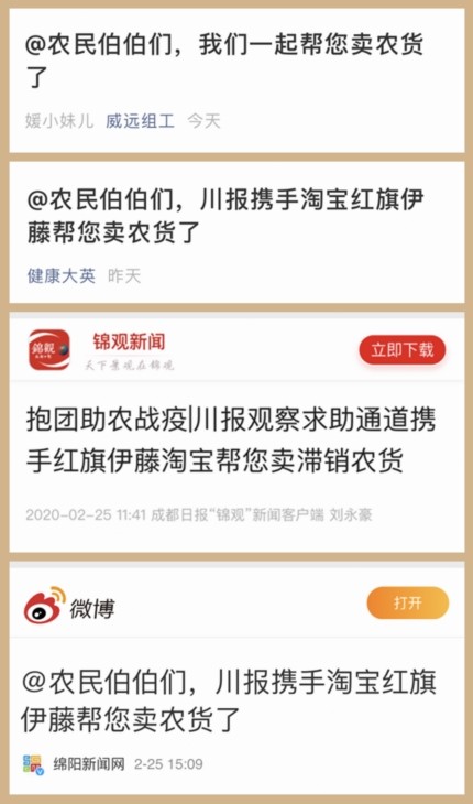 川報全媒體集群“抱團助農(nóng)戰(zhàn)疫活動”一上線,其整合政府、媒體、電商和大型超商的力量,幫助農(nóng)戶進行產(chǎn)銷對接的模式,就引起了四川各地市州媒體及縣級融媒體中心的關(guān)注。