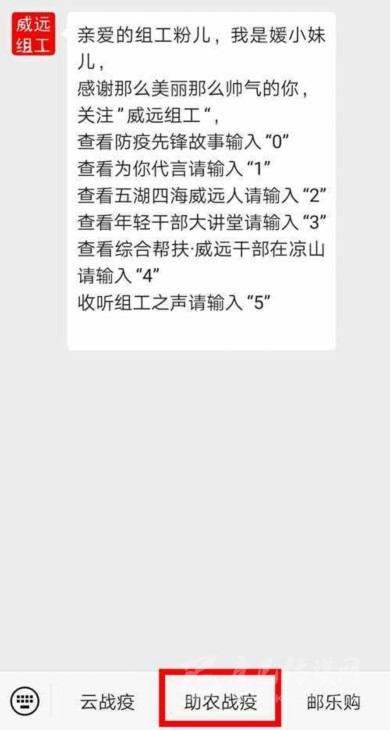除了媒體之外,一些機關(guān)單位的政務(wù)新媒體也為活動“站臺”,“威遠(yuǎn)組工”官方微信公眾號的底部菜單欄,特別新增了“助農(nóng)戰(zhàn)疫”專欄,直接連通川報觀察頁面,為當(dāng)?shù)剞r(nóng)戶及農(nóng)業(yè)經(jīng)營戶提供解決難題的路徑。