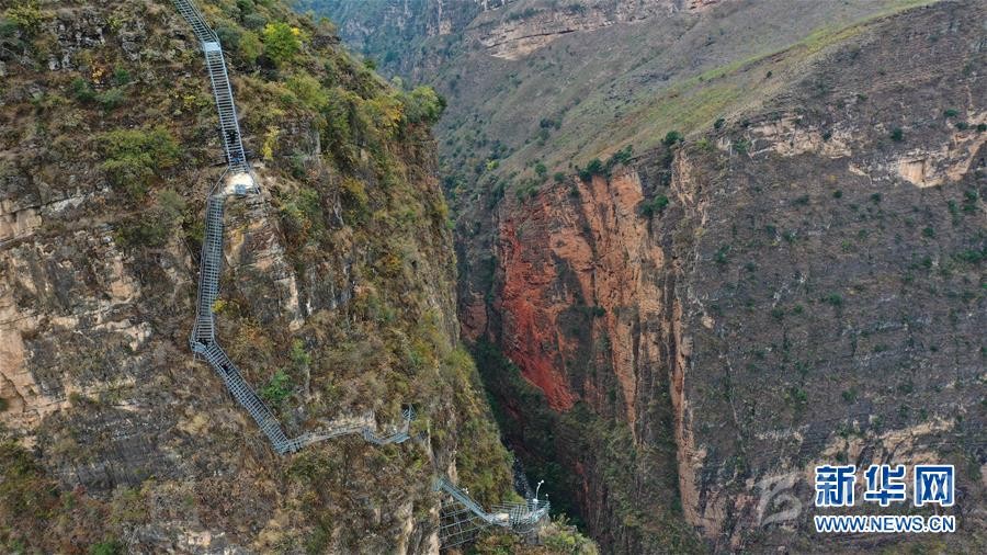 這是2019年11月22日拍攝的四川省昭覺(jué)縣支爾莫鄉(xiāng)阿土列爾村的懸崖鋼梯(無(wú)人機(jī)照片)。新華社記者 王曦 攝