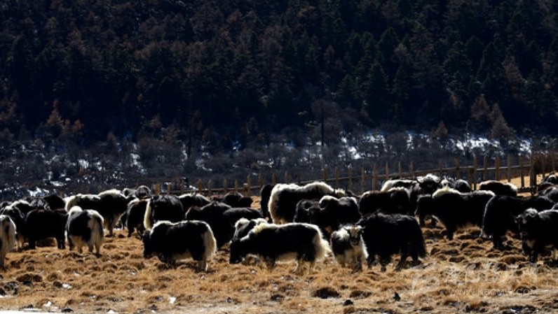 這是甘孜藏族自治州境內的景象,森林、草甸、河流、牦牛還有皚皚白雪(2016年12月31日攝)。新華社記者 陳天湖 攝