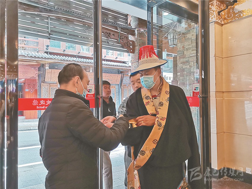 色達縣演出隊入住邦金麥朵酒店。每天,酒店安保人員多扎準時出現在門口,提醒演職人員測量體溫、佩戴口罩。“我是酒店的第一關卡,拉姆是第二關,我倆相互配合,表演節(jié)目的客人住得放心,演出的節(jié)目才會更加精彩?!蹦弥w溫槍,多扎一臉自豪地說。