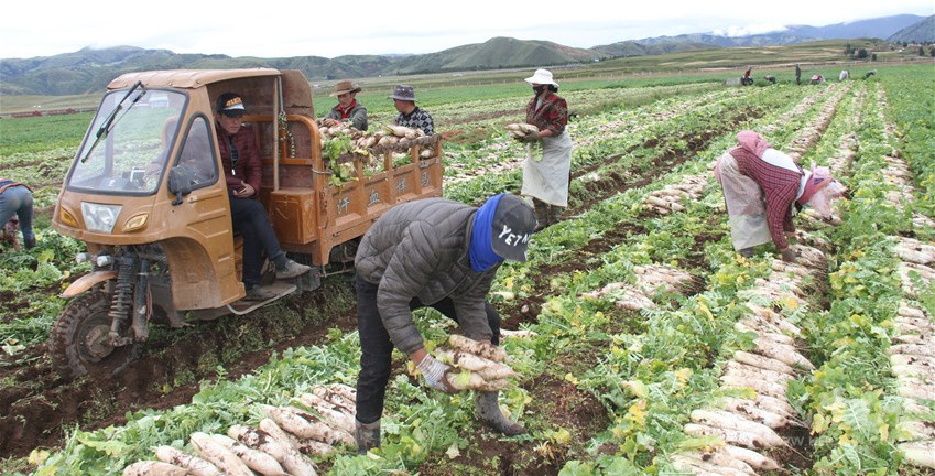 一根根白蘿卜,從理塘縣的沙礫地里,被農(nóng)牧民拔出來,被迅速清洗、包裝,及時(shí)裝上排隊(duì)等候的冷鏈車。過雅江,翻折多山、二郎山,在雪域高原行駛四百公里后,抵達(dá)川西平原,再上成渝環(huán)線高速,后經(jīng)廈蓉高速,抵達(dá)珠海、深圳,進(jìn)入香港、澳門市場(chǎng)。