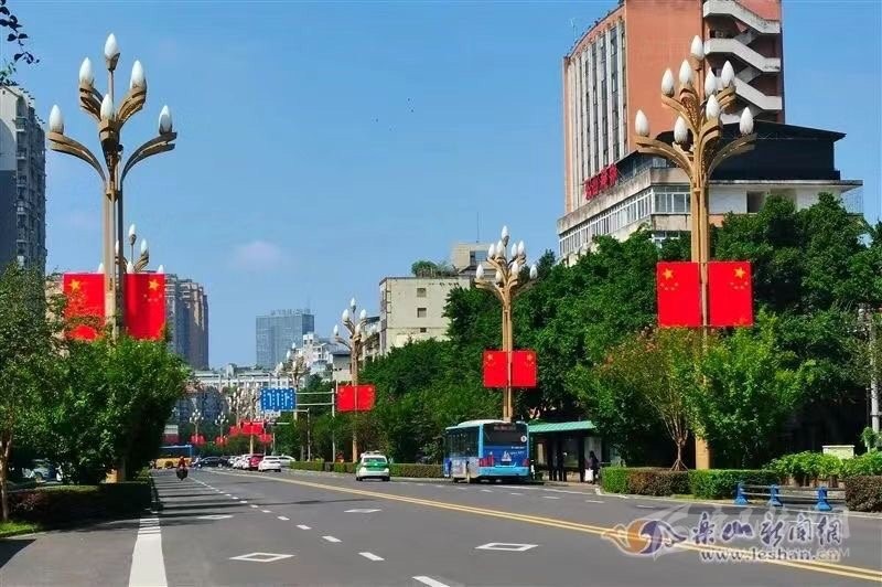 在樂山市,為營造喜慶、熱烈、歡樂、祥和的節(jié)日氛圍,中心城區(qū)嘉定路、柏楊路等多條主干道,以及樂山岷江一橋和二橋共計1217柱燈桿上,懸掛了2000多面國旗,換上“紅裝”后的街道,在藍天的映襯下顯得格外美麗。