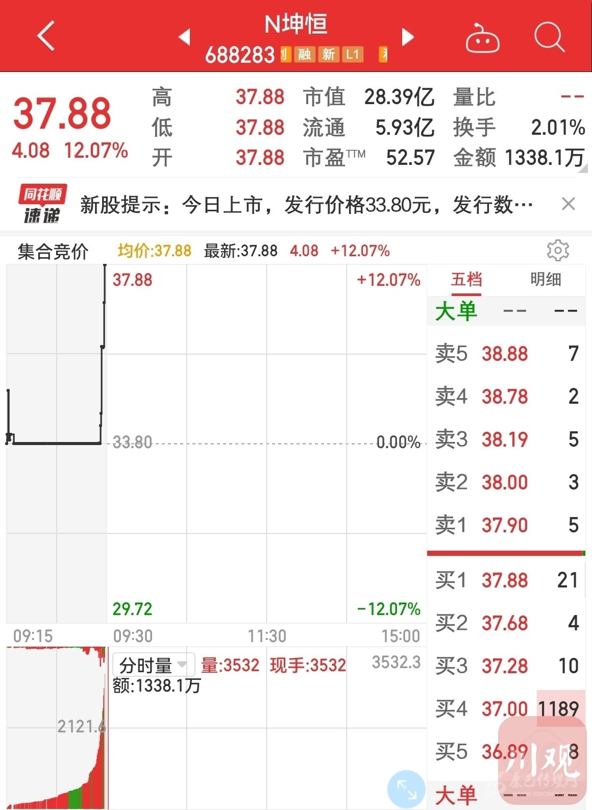 2月15日上午,四川企業(yè)成都坤恒順維科技有限公司在上海證券交易所西部基地敲響上市鑼聲。首日發(fā)行價(jià)33.8元,開(kāi)盤價(jià)為37.88元,漲幅12.07%。