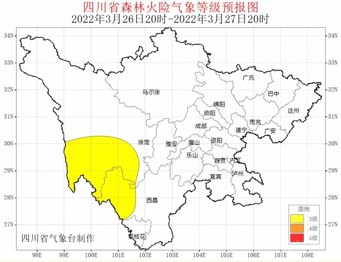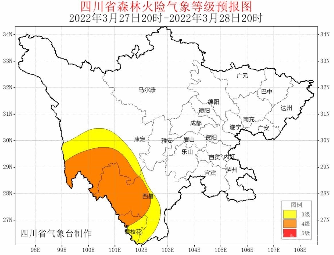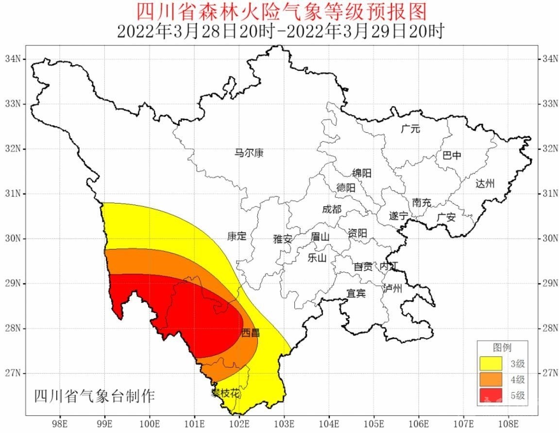 據(jù)最新氣象資料分析:3月27日~29日,攀西地區(qū)西部和甘孜州南部以多云間晴天氣為主,氣溫升高,森林草原火險氣象等級可達(dá)3~5級。
