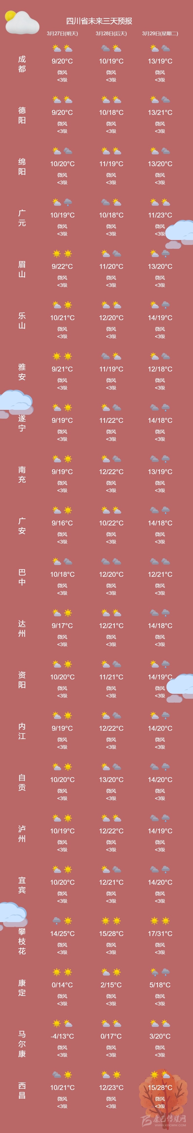 預(yù)計28~29日盆地大部多云,局部陣雨,川西高原和攀西地區(qū)晴間多云;30日~4月2日我省有一次降溫、降水天氣過程,其中盆地大部和攀西地區(qū)及川西高原東部南部有小到中雨,局部大雨。