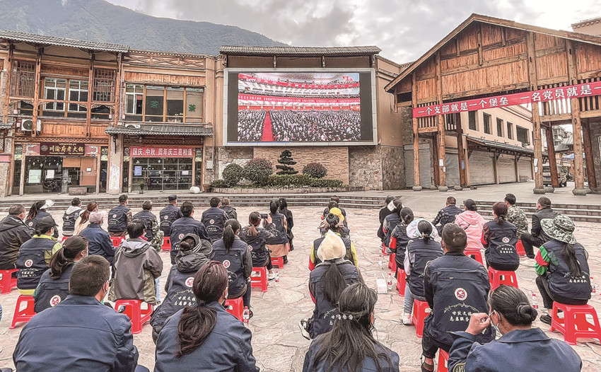 海螺溝干部群眾在貢嘎廣場(chǎng)收看黨的二十大開(kāi)幕會(huì)。 海宣 攝