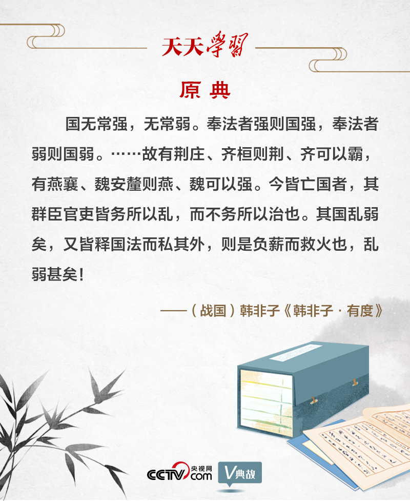 韓非子是戰(zhàn)國時期法家思想的集大成者?!坝卸取?,就是有法度。韓非子把“奉法”作為治亂興亡的關(guān)鍵,提出“國無常強(qiáng),無常弱。奉法者強(qiáng)則國強(qiáng),奉法者弱則國弱”。意思是,國家不會永遠(yuǎn)富強(qiáng),亦不會長久貧弱。執(zhí)行法度的人堅決,國家就會富強(qiáng);執(zhí)行法度的人軟弱,國家就會貧弱。