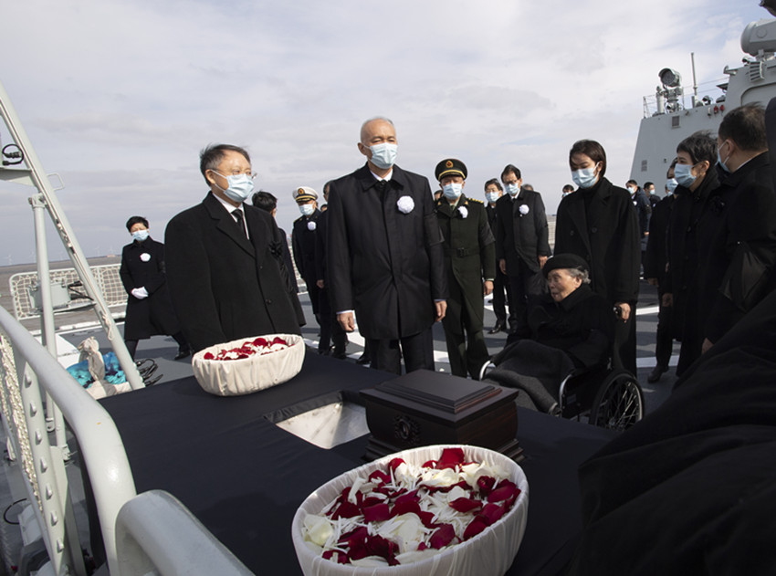 中午12時35分,揚州艦抵達長江入海口水域。在軍艦甲板上,送別的人們,肅立默哀。水天肅穆,波翻浪涌。蔡奇和江澤民同志的夫人王冶坪等親屬,眼含熱淚,強忍悲痛,將江澤民同志的骨灰和繽紛的花瓣一起緩緩撒向無垠的江海。